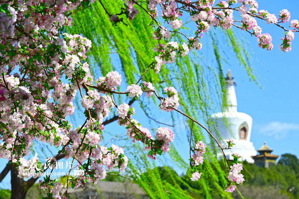 2026年4月5日,在北京奥林匹克公园,游客们于新奥购物中心旁赏花打卡。春日繁花拉动文旅消费,彰显了“赏花经济”在赋能城市商业、激发消费活力方面的积极作用。人民网 席彪摄